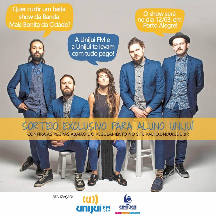 Está no ar a partir de hoje a promoção que levará um aluno da UNIJUÍ ao show da Banda Mais Bonita da Cidade, que sobe ao palco do Theatro São Pedro, em Porto Alegre, no dia 12 de março, a partir das 21h. Organizada pela UNIJUÍ FM e UNIJUÍ, o estudante irá assistir ao show e participar da transmissão que a rádio irá realizar ao vivo, integrando a programação do projeto Trilha Cultural. O sorteado terá todas as suas despesas de estadia, alimentação e transporte pagas pelos organizadores.