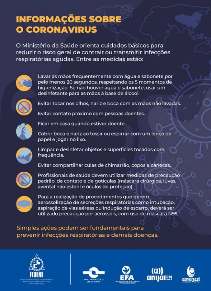 A FIDENE/UNIJUÍ já havia divulgado nota oficial de ações e orientações quanto ao coronavírus, seguindo as diretrizes dos órgãos nacionais, regionais e locais de saúde e de educação. São elas: