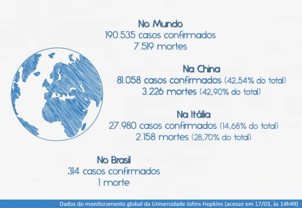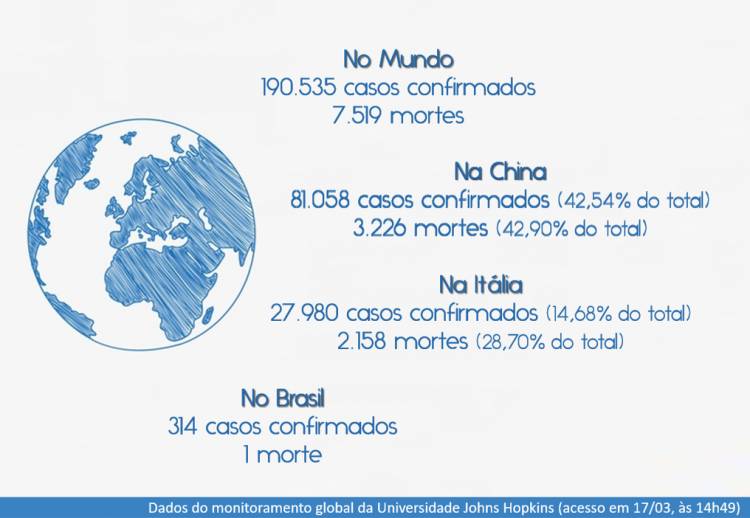 Os números de casos e de mortes por Covid-19 fora do território chinês já ultrapassaram os registrados na própria China, segundo monitoramento da Universidade Johns Hopkins, dos Estados Unidos (dados coletados às 14h49, de 17/03). No país asiático, onde a doença surgiu, foram confirmados 81.058 casos e 3.226 mortes. Em todo o mundo, são 190.535 casos e 7.519 mortes. Na Itália, novo epicentro do coronavírus, são 27.980 casos da doença e 2.158 mortes.