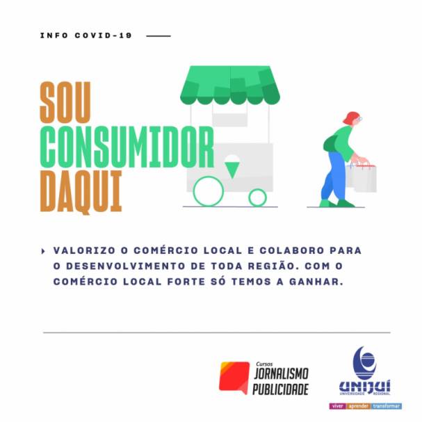 Para a Campanha “Sou Daqui”, foram desenvolvidos um mote de comunicação, peças publicitárias e materiais para a publicação em redes sociais e diversas mídias. Esta campanha justamente veio para mostrar às comunidades a importância do fortalecimento dos negócios locais neste momento de crise. “A proposição é mostrar a importância da união, fortalecendo enormemente a ideia de que a Unijuí e as associações estamos trabalhando em conjunto para o bem de todos”, salienta a professora Nilse Maldaner.