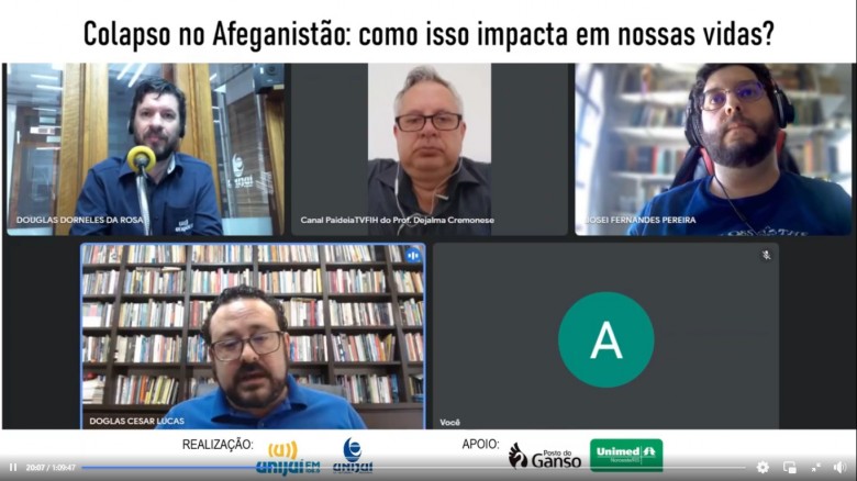 Para debater o assunto “Colapso no Afeganistão: como isso impacta em nossas vidas?”, o Rizoma Temático desta quinta-feira, 2 de setembro, trouxe três convidados: o mestre em História e professor da Unijuí, Josei Fernandes; o doutor em Ciência Política e professora da Universidade Federal de Santa Maria (UFSM), Dejalma Cremonese; e o pós-doutor em Direito e professor do Programa de Pós-Graduação em Direitos Humanos (PPGDH) da Unijuí, Doglas César Lucas.