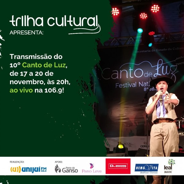 A Rádio UNIJUÍ FM irá transmitir, a partir desta quarta-feira, dia 17 de novembro, a 10ª edição do Festival Nativista Canto de Luz. A transmissão faz parte do Projeto Trilha Cultural e conta com apoio do Posto do Ganso, Dr. Auto Peças, Pano Leve, Laboratório Hemovita, Leal Madeiras e Rustic Móveis.