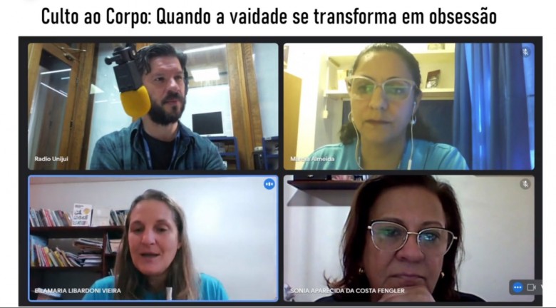 Para debater o tema “Culto ao corpo: quando a vaidade se transforma em obsessão”, o Rizoma Temático desta quarta-feira, 20 de abril, convidou a diretora da Editora Unijuí e doutoranda em Comunicação, professora Márcia Regina de Almeida; a doutora em Desenvolvimento Regional e graduada em Nutrição, professora Eilamaria Libardoni Vieira; e a coordenadora do curso de Psicologia da Unijuí e mestre em Educação nas Ciências na área de Psicologia, professora Sonia da Costa Fengler.