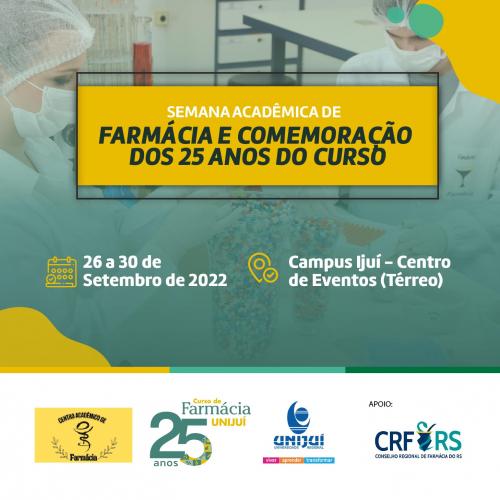 Acontece entre os dias 26 e 30 de setembro a Semana Acadêmica de Farmácia, um momento especial em referência aos 25 anos do curso na Universidade.