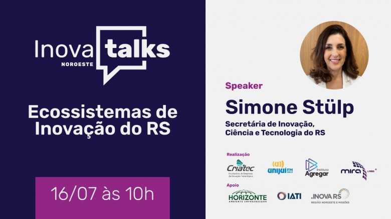 Na terça-feira, 16 de julho, estreou o novo programa da rádio Unijuí FM, o Inova Talks. O episódio piloto do programa trouxe a temática Ecossistemas de Inovação no Rio Grande do Sul, com a Secretária de Inovação, Ciência e Tecnologia do RS, Simone Stülp.
