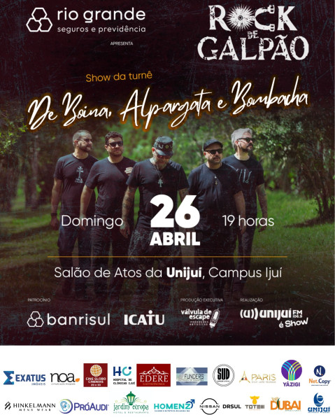 O grupo Rock de Galpão se apresenta em Ijuí no próximo dia 26 de abril, às 19h, no Salão de Atos da Unijuí, com o espetáculo da turnê “De Boina, Alpargata e Bombacha”. O show marca a nova fase da banda e traz ao público as músicas do álbum autoral inédito, lançado recentemente nas plataformas digitais.