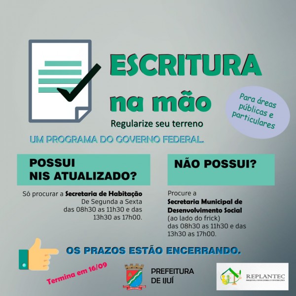 Em Ijuí o projeto é desenvolvido pela prefeitura de Ijuí e o Replantec. Aos interessados: Quem possui NIS atualizado deve Procurar a Secretaria de Habitação. Se não possui NIS a pessoa deve procurar a Secretaria Municipal de Desenvolvimento Social, este projeto é válido até o dia 16 de Setembro.