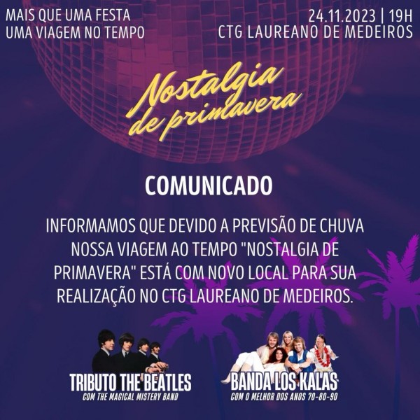 Duas bandas, praça de alimentação, espaço kids, área open bar, sorteio de brindes com apoiadores e um clima de muita alegria no ar, com a saudade dos bons tempos sendo revivida Assim promete ser a noite de sexta-feira, 24, no CTG Laureano Medeiros, para a Festa Nostalgia de Primavera, promovida pela Unijuí FM juntamente com a Tributo Produções de Porto Alegre.