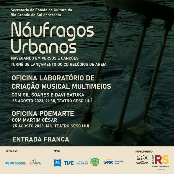 No dia 26, sábado, às 20h, acontece no Teatro do Sesc Ijuí o Show Relógios de Areia, com o grupo Náufragos Urbanos e Martim César. Como estímulo à formação de novos talentos, na abertura do show, contamos ainda com a participação do grupo “A Cena Vive”, grupo ijuiense, que desde 2018, atua no fomento à produção audiovisual independente e autoral envolvendo jovens da comunidade, e mais recentemente participam de um projeto que leva através de oficinas a cultura do Hip Hop para as escolas. O Show Relógios de Areia faz parte de uma turnê do grupo Náufragos Urbanos, que teve início em maio na cidade de Caxias do Sul, passou por Porto Alegre, e após a apresentação de Ijuí o grupo segue rodando o Rio Grande do Sul, com destino à Pelotas.